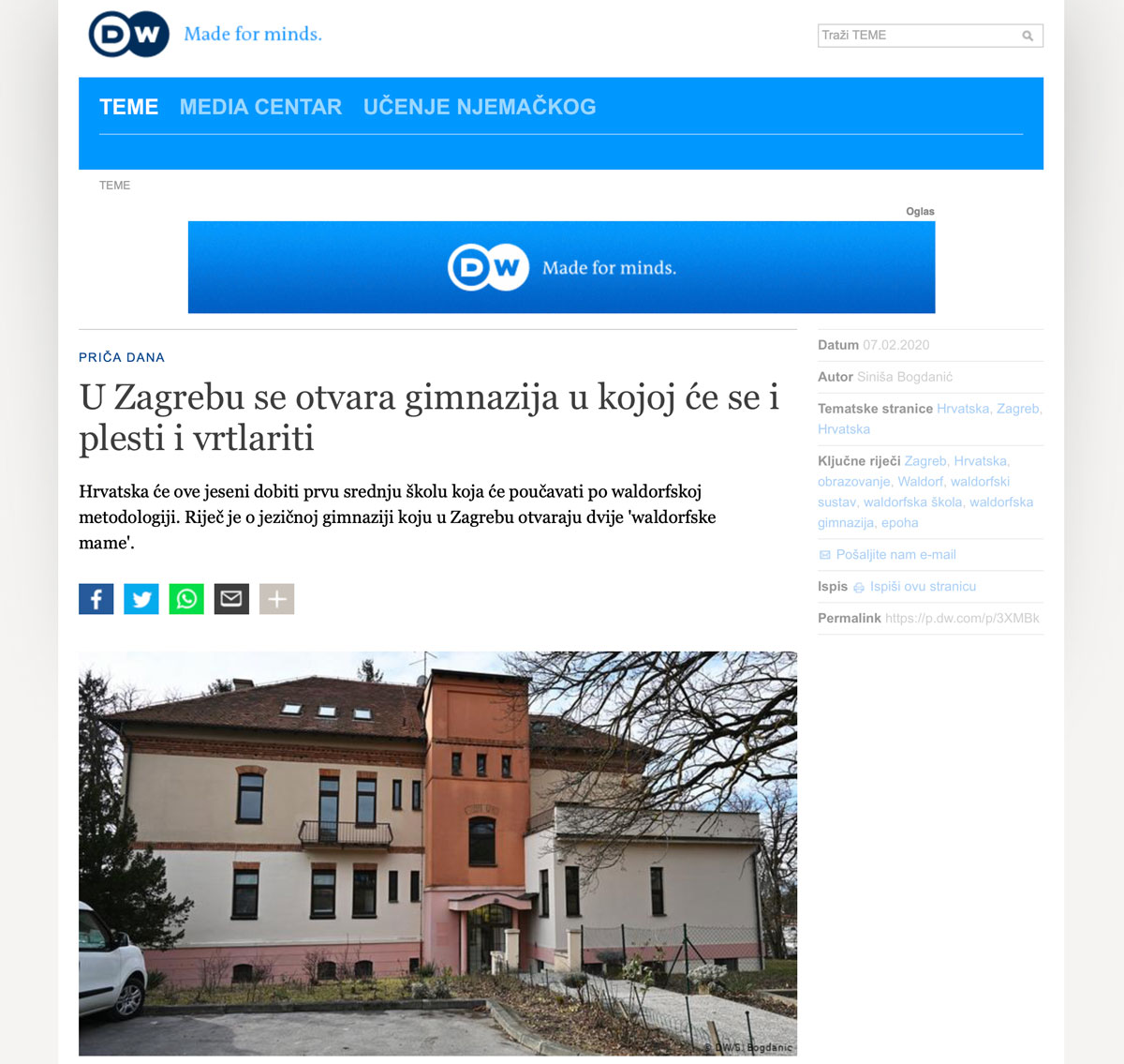 “Hrvatska će ove jeseni dobiti prvu srednju školu koja će poučavati po waldorfskoj metodologiji. Riječ je o jezičnoj gimnaziji koju u Zagrebu otvaraju dvije ‘waldorfske mame’.” Siniša Bogdanić, DW